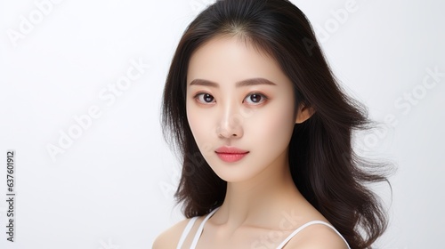 Portrait of a smiling brunette woman with long black hair, natural makeup, and captivating eyes posing in a studio, exuding beauty and glamour