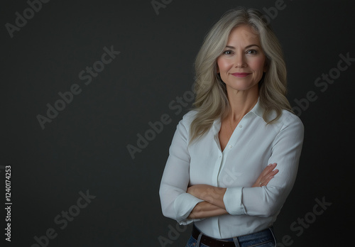Portrait of a smiling business woman standing with arms crossed on a grey background, wearing a white shirt and jeans. A female entrepreneur