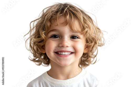 Portrait of a smiling child with curly hair, isolated on a transparent background. wearing a white shirt.