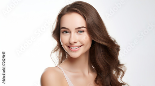 Portrait of a smiling confident woman in a casual white singlet on white background