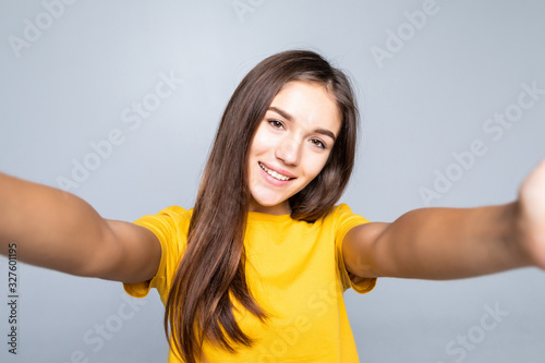 Portrait of a smiling cute woman making selfie photo on phone isolated on a white background