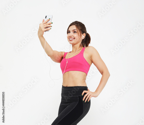 portrait of a smiling fitness woman with smartphone. Selfie time. over white background