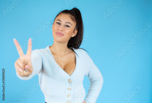 Portrait of a smiling happy woman showing victory sign and looking at camera isolated on the blue background