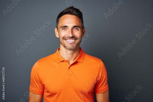 Portrait of a smiling man in his 30s wearing a sporty polo shirt against a solid color backdrop. AI Generation