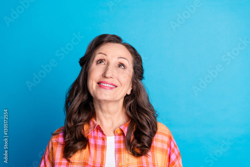 Portrait of a smiling mature woman with a charming and joyful expression, set against a bright blue background
