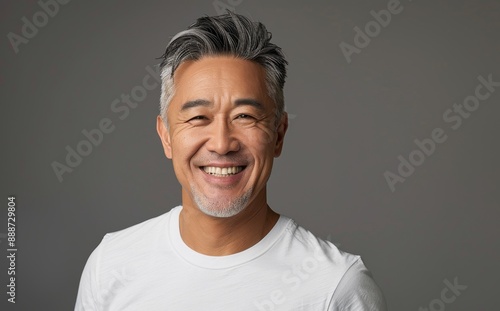 Portrait of a smiling middle aged asian man with wearing a white t-shirt.