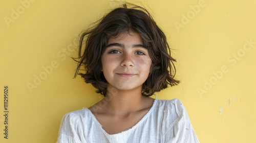 Portrait of a smiling middle eastern student with crossed arms against a bright yellow background