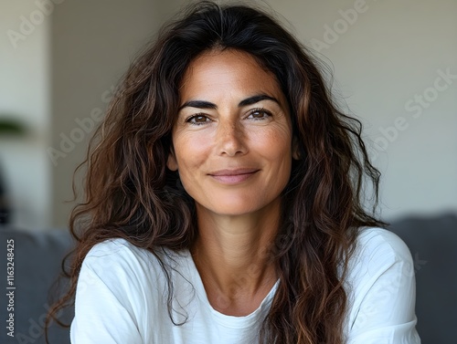 Portrait of a Smiling Middle-Aged Woman with Long Brown Hair