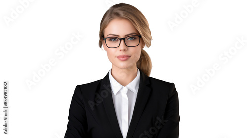 Portrait of a smiling secretary business woman wearing eyeglasses in suit, isolated on transparent background
