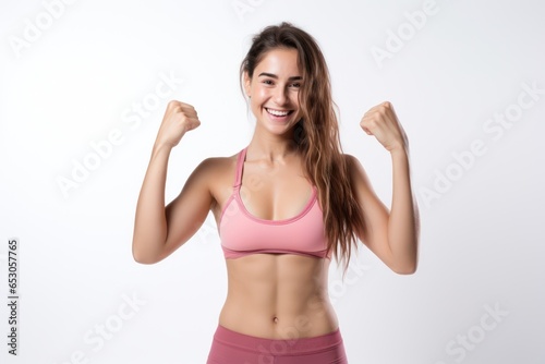 Portrait of a smiling sportswoman in pink sportswear showing her biceps isolated on a white background and Looking at the camera.