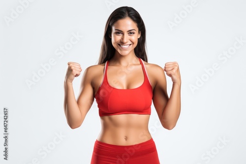 Portrait of a smiling sportswoman in red sportswear showing her biceps isolated on a white background and Looking at the camera.