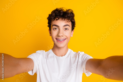 Portrait of a smiling teenage boy in a white t-shirt against a vibrant yellow background, expressing happiness and youthfulness