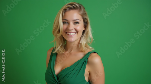 Portrait of a Smiling Woman in a Green Dress Against a Green Background, Exuding Elegance and Happiness
