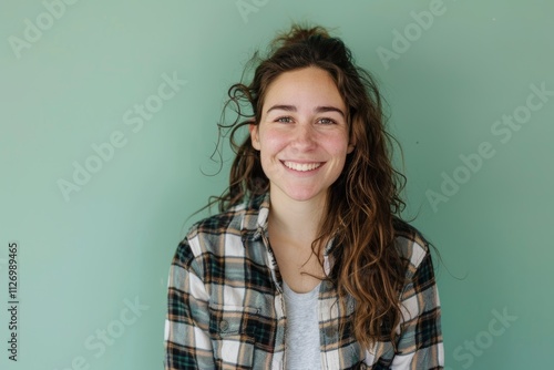 Portrait of a smiling woman in her 30s wearing a comfy flannel shirt over pastel green background