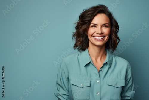 Portrait of a smiling woman in her 40s sporting a versatile denim shirt in soft teal background
