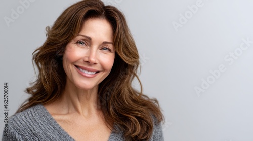 Portrait of a smiling woman studio photography neutral background close-up positive vibes for wellness and beauty