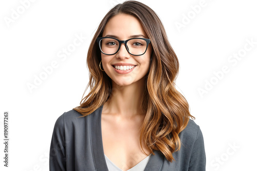 Portrait of a smiling woman wearing glasses, isolated on transparent background