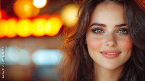 Portrait of a smiling woman with beautiful blue eyes in a vibrant cafe atmosphere