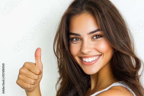 Portrait of a smiling woman with brown hair giving a thumbs up against a white background in studio