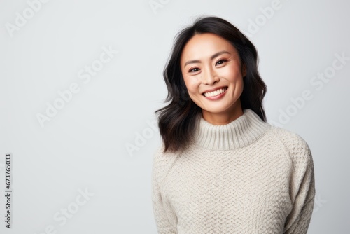 Portrait of a smiling young asian woman standing against white background
