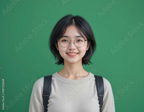 Portrait of a Smiling Young Asian Woman with Short Hair and Glasses Against a Green Background: A Study in Simplicity and Cheerfulness