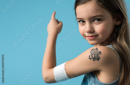 Portrait of a Smiling Young Girl with Long Brown Hair, White Tank Top, and Orange Patch on Her Arm, Set Against a Light Blue Background, Radiating Happiness and Confidence with bandage on arm