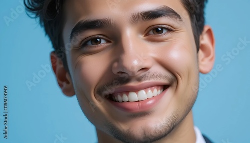 Portrait of a Smiling Young Man in Professional Attire with Bright Eyes and Warm Expression on Light Blue Background