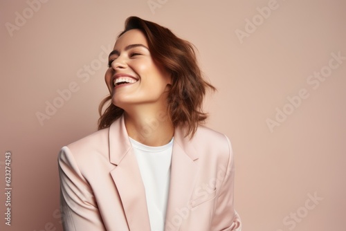 Portrait of a smiling young woman in a pink jacket on a beige background