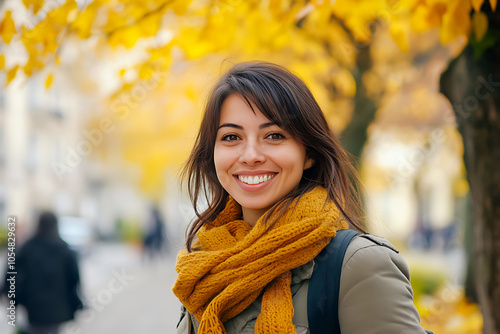 Portrait of a smiling young woman wearing a yellow scarf enjoying a sunny autumn day in the city