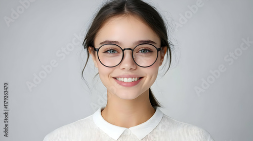 Portrait of a Smiling Young Woman Wearing Glasses and a White Shirt on a Gray Background.
