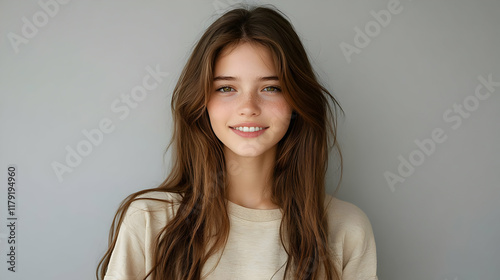 Portrait of a Smiling Young Woman with Long Brown Hair and Freckles on a Gray Background