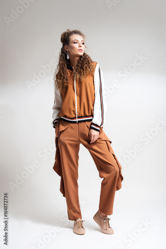 Portrait of a smilling brunette woman over white background. Fashion lookbook.