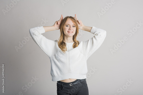Portrait of a stylish and cheerful girl on a white background in the studio who shows funny grimaces