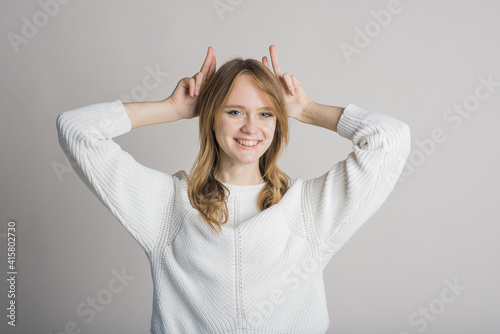 Portrait of a stylish and cheerful girl on a white background in the studio who shows funny grimaces