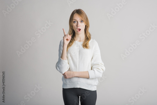 Portrait of a stylish and smiling girl on a white background in the studio with a great idea