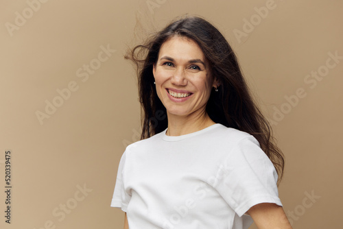 portrait of a sweet, beautiful, charming, pleasant woman with black hair, blowing in the wind, in a white T-shirt. Studio photo on a plain background