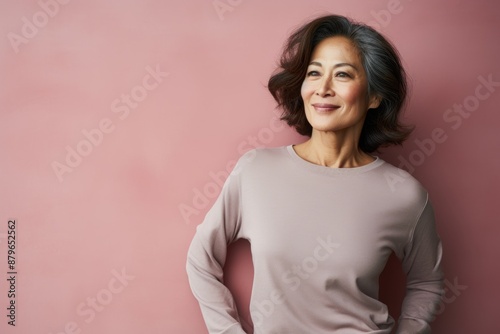 Portrait of a tender asian woman in her 50s showing off a thermal merino wool top isolated on solid pastel color wall