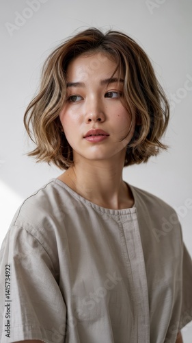 Portrait of a thoughtful woman gazing sideways with soft lighting and casual attire, capturing a serene expression.