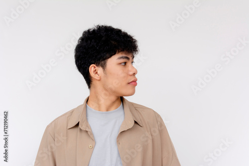 Portrait of a thoughtful young Asian man looking pensively to the side, potential for copy space.