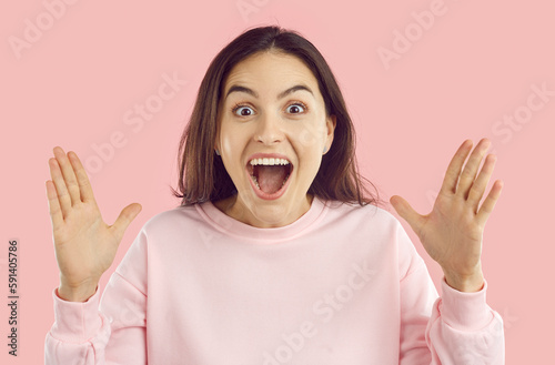 Portrait of a very surprised, happy woman. Beautiful young brunette girl in a pink sweatshirt standing on a pink background and looking at the camera with an excited, amazed, joyful face expression