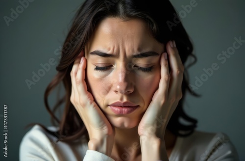 Portrait of a woman holding her head, temples, headache. fatigue, migraines