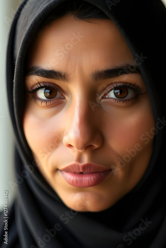 Portrait of a woman in a hijab indoor setting close-up photography natural light intimate mood