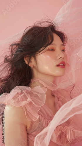 Portrait of a woman in a pink dress with a dreamy expression on her face