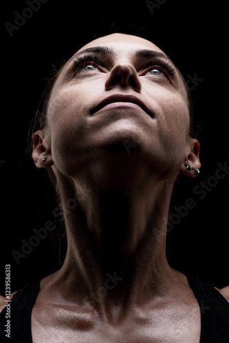 Portrait of a Woman Looking Up Against a Dark Backdrop