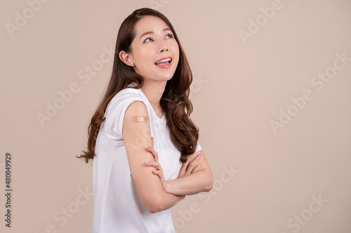 Portrait of a woman smiling after getting a vaccine. Young woman holding her arm with hand and showing bandage after receiving vaccination on her shoulder