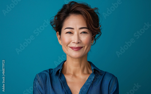 Portrait of a Woman Smiling in a Blue Shirt Against a Teal Background