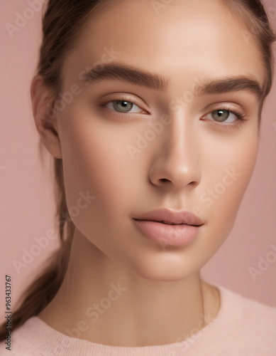 portrait of a woman with a ponytail wearing a white top, set against a plain pink background.