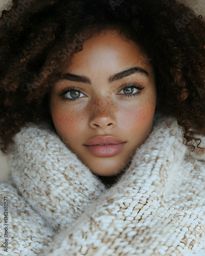 Portrait of a woman with beautiful eyes and freckles, wearing a cozy sweater
