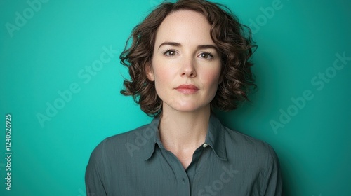 Portrait of a Woman with Curly Hair Against a Teal Background