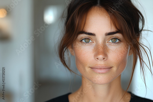 Portrait of a woman with freckles and blue eyes looking calmly into the camera